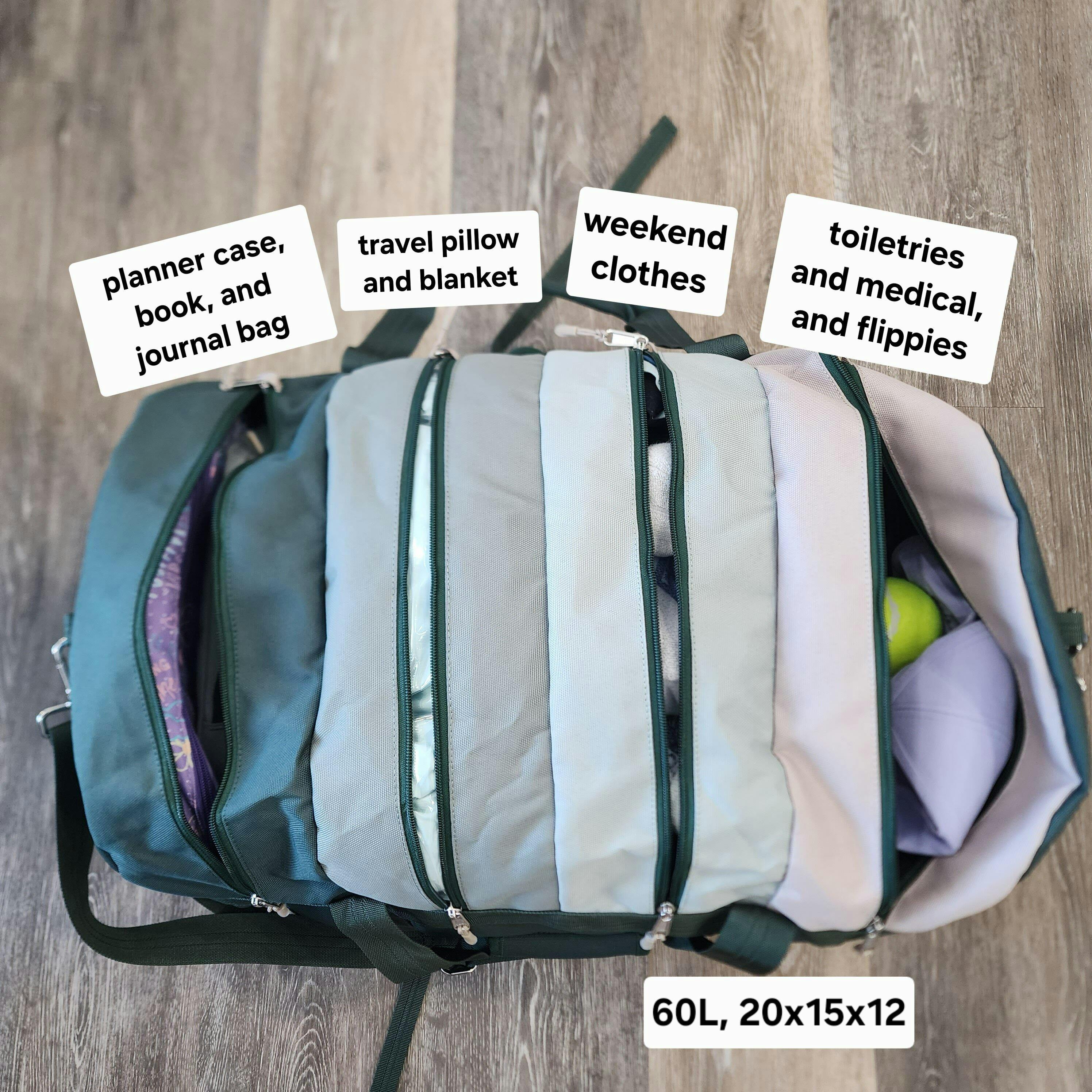 I have chronic illness and going on a weekend trip (travel + adapting to unfamiliar spaces) requires a lot of accessories, aka tote bags in the trunk. I need to be able to find what I need and not have it all scrambled in one big bag that I have to dig through, so the Tobiq 60L duffle is so perfect!! This bag fits everything I need and want to bring, keeps it contained and organized well, and is so pretty in the Highlands colorway!! In the past, people have commented on and made me feel self-conscious about how much stuff I bring/how many bags I have 🫠 (personally, I think you deserve a free extra bag for every illness 😅💙), so now hopefully they will just be dazzled by how awesome my bag is! It easily accommodates my travel needs with its unique design and I can't wait to look so cool and feel more confident when I travel next!!