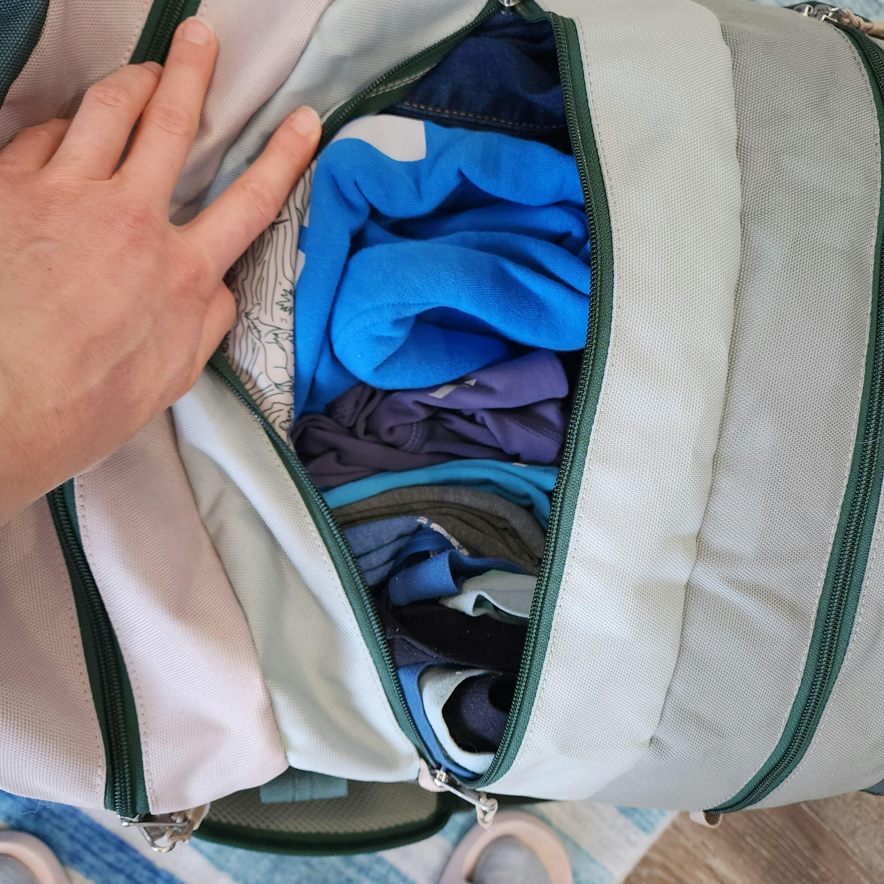 I was really excited about this bag, maybe too excited. I have a bag of equal size, different brand, no dividers so the items sink to the bottom when I wear it as a backpack. So when I saw this I figured, same space, so movement, but the dividers kind of reduces the space despite being thin. I had a hard time fitting half of the things I wanted into it. It's kind of a waste for me as I wanted it to be my carry-on replacement. The positives if you don't have to carry much, its cute, the colors are nice. Made well, I love the fabric design inside. Might be a nice kids bag which is what I will probably use it for, my kids clothes for overnights.