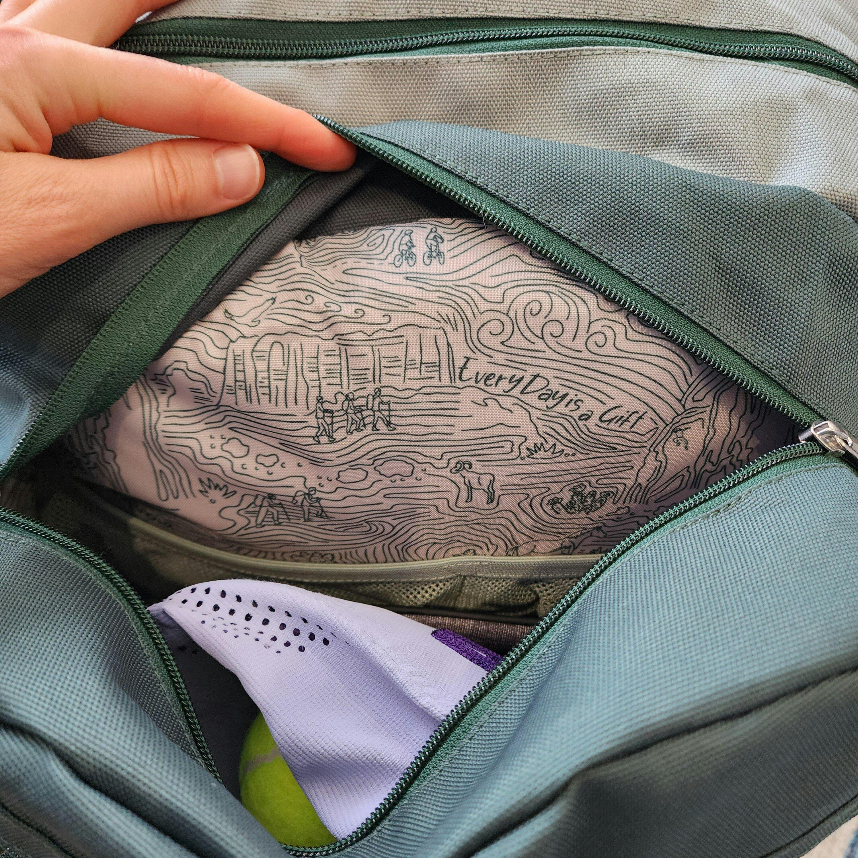 Design features that rock: backpack mode! I was afraid storing planners and books perpendicular to my back would hurt, but this bag also has a double thick laptop sleeve, so I don't feel a thing! Amazing quality and colors, plus the inside is such a cute illustration! The shape fits more than a large rectangle packing cube, so you can really fit a lot and they don't slide around! Specfically for me, it fits my small planner/laptop bag, which I am thrilled about! 😅 There are handles or straps on every side for easy moving and lifting!